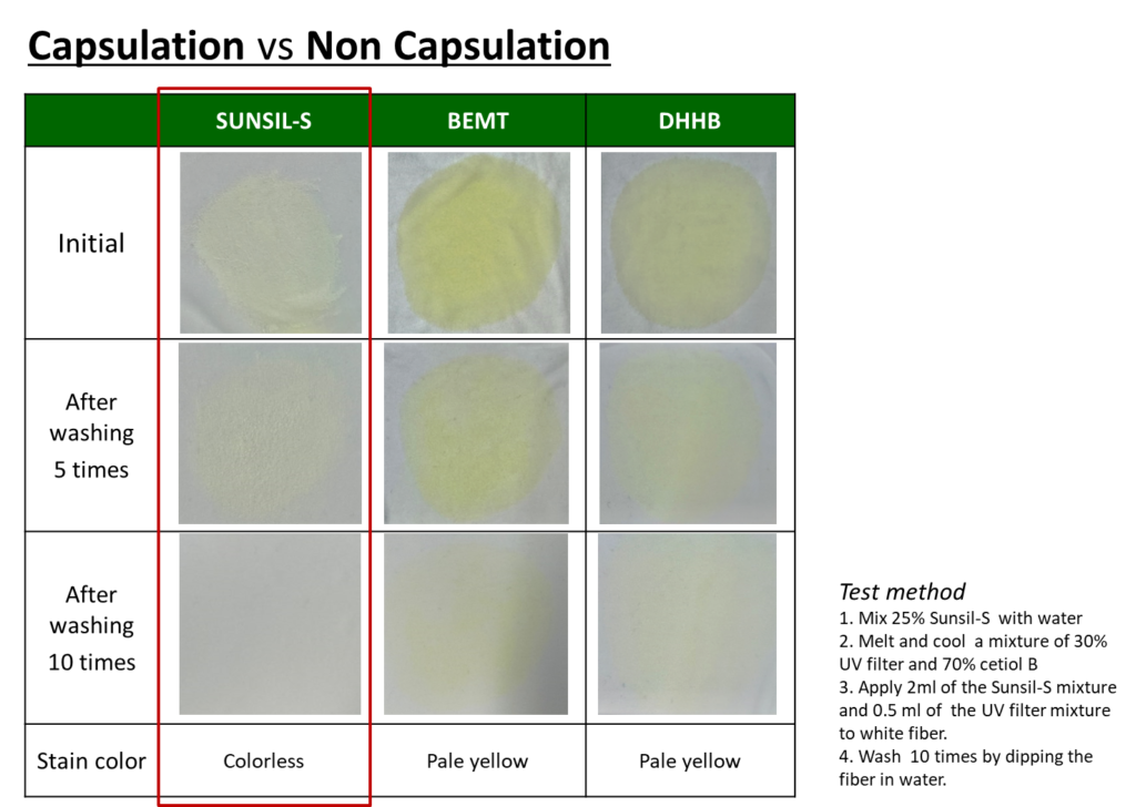 Conventional UV filters such as BEMT or DHHB tend to leave yellow stains on fabrics, which are difficult to remove even after multiple washes. In contrast, with SUNSIL-S, BEMT does not come into direct contact with fabrics, preventing staining and ensuring easy washability.