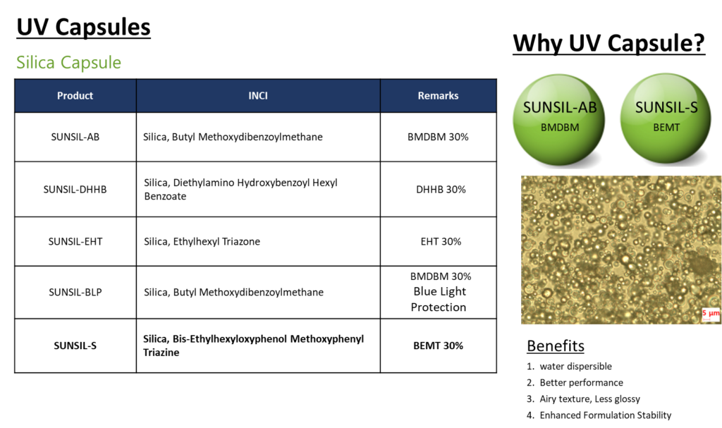 Sunjin Beauty Science offers not only BEMT-loaded silica capsules but also a wide range of products incorporating various chemical UV filters. These UV capsules provide multiple benefits, including reduced stickiness, enhanced photostability, and improved UV protection.