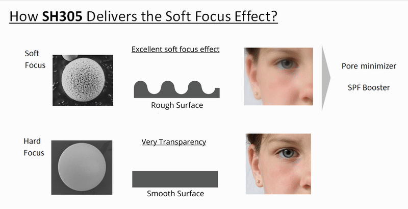 In short, SH305 is an innovative material that addresses both the aesthetic desire for flawless skin (through soft focus) and the functional need for sun protection (as an SPF booster).
