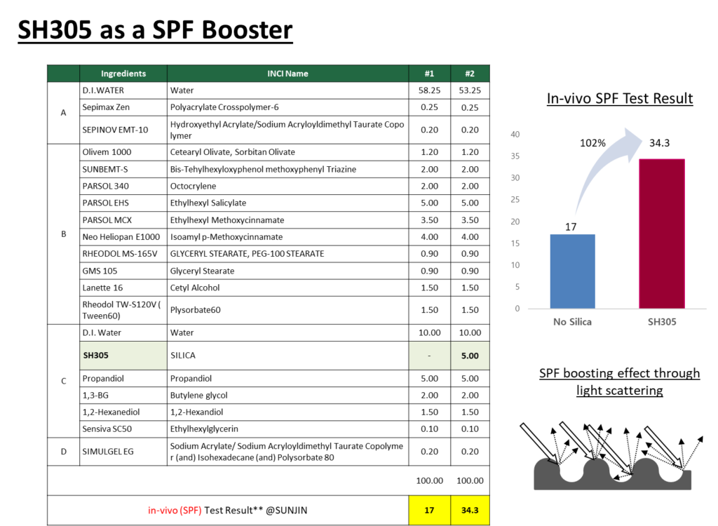 This performance has been confirmed in actual in-vivo studies. When SH305 is incorporated at 5%, SPF values more than double compared to the baseline, and this improvement is attributed to SH305’s unique dispersion mechanism rather than a simple additive effect.